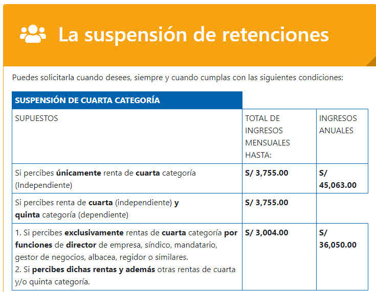 - Podrán solicitar suspensión de retenciones de cuarta categoría:Cuando las rentas de cuarta categoría y quinta categoría proyectadas no superen S/ 38 500,00 anuales